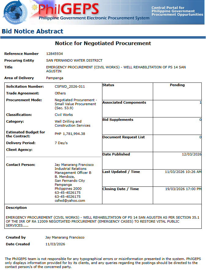 EMERGENCY PROCUREMENT (CIVIL WORKS) – WELL REHABILITATION OF PS 14 SAN AGUSTIN by CSFWD | Mar 11, 2026 | Bids and Awards